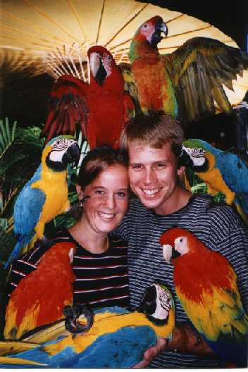 Tamann and Squeeky holding birds in Hawaii on their honeymoon
